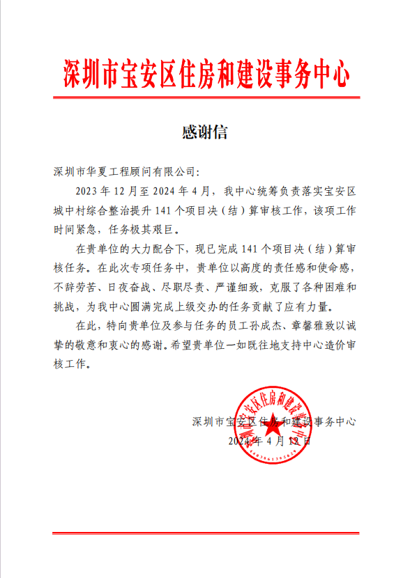 深圳市宝安住房和建设事务中心感谢信